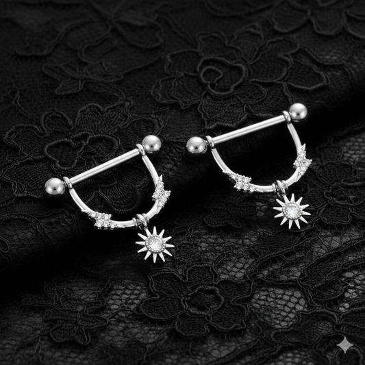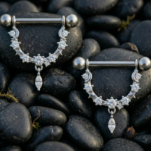 Dangle Nipple Piercing Bar Shields with Star Cubic Zirconia – 14G Surgical Steel 316L