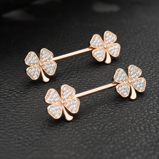 Clover Leaf Nipple Piercing Bars with CZ - 14G Rose Gold Surgical Steel 316L