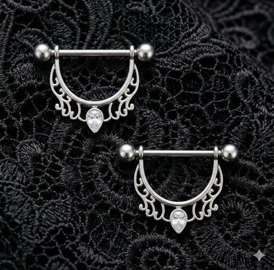 Dangle Nipple Piercing Bar Shields with Cubic Zirconia – 14G Surgical Steel 316L