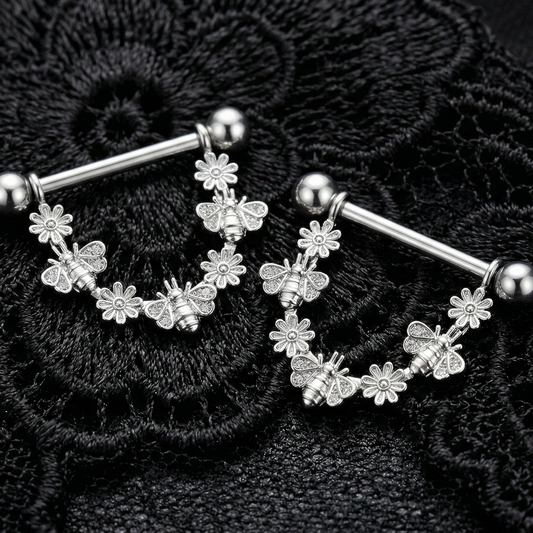 Dangle Nipple Piercing Bar Shields with Bees and Flowers – 14G Surgical Steel 316L