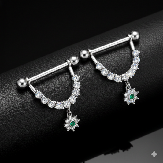 Dangle Nipple Piercing Bar Shields with Flower Cubic Zirconia – 14G Surgical Steel 316L