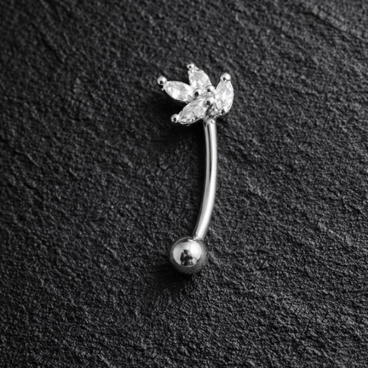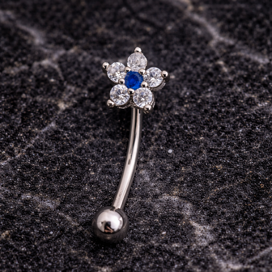 Silver Flower Barbell for Eyebrow or Rook Piercing with Blue Zirconia – 16G Stainless Steel Jewelry