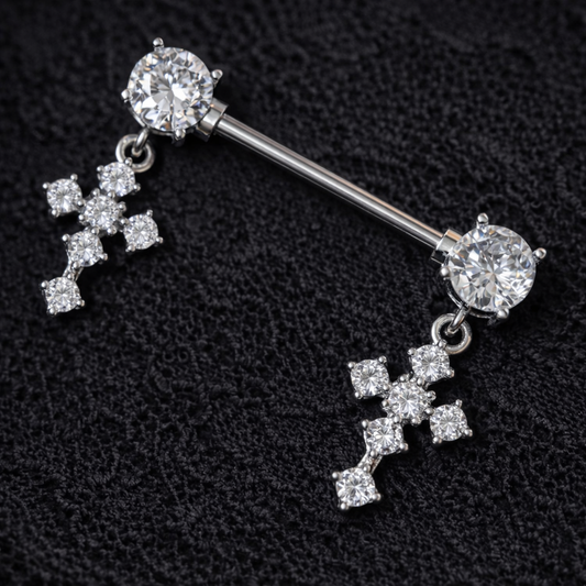 Silver Nipple Bars with Cross Dangly Ends - 14G Surgical Steel 316L