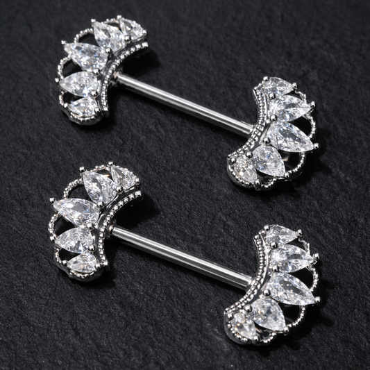 Silver Nipple Bars with Detailed Crown Cubic Zirconia - 14G Surgical Steel 316L