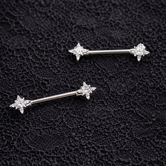 Silver Nipple Bars with Star Sparkling Cubic Zirconia - 14G Surgical Steel 316L