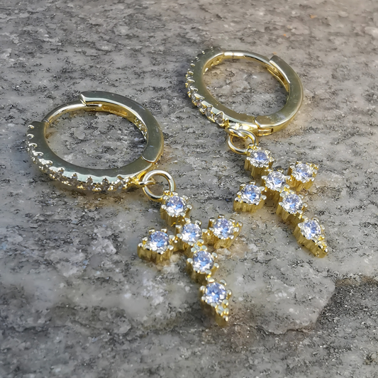 Droplets Cross Earrings with CZ Piercing - 18K Gold Plated 925 Sterling Silver