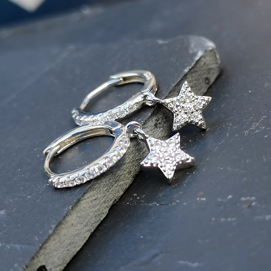 Star Silver Droplets with Cubic Zirconia Earrings 925 Sterling Silver - Ear Piercing