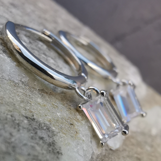 Droplet Earrings Silver Rectangle Clear 5A Cubic Zirconia - 925 Sterling Silver