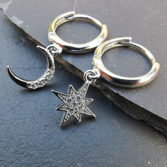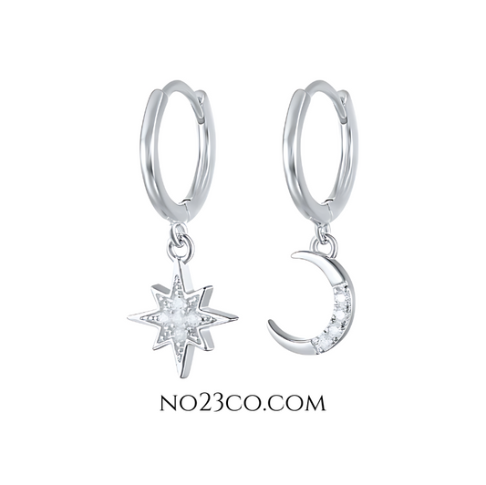Star and Moon Droplets Earrings with 5A Cubic Zirconia - 925 Sterling Silver