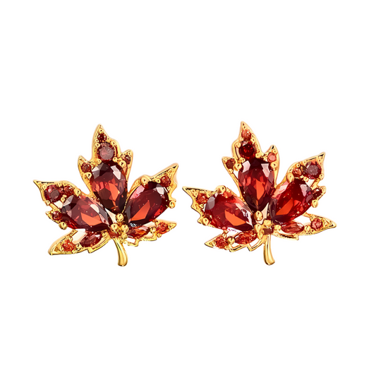 Maple Leaf Stud Earrings with Brown Zirconia - 18K Gold Plated 925 Sterling Silver