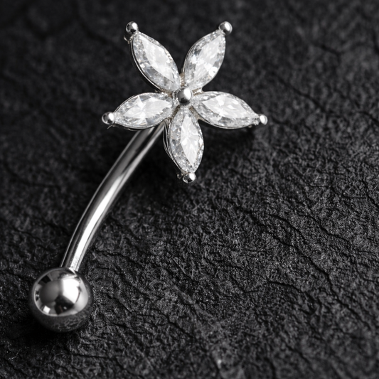 Silver Flower Barbell for Eyebrow or Rook Piercing with Blue Zirconia – 16G Stainless Steel Jewelry