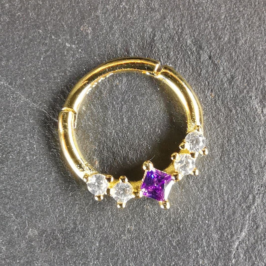 Septum & Daith Piercing Ring with Purple and White Stone - 18K Gold Plated 925 Sterling Silver