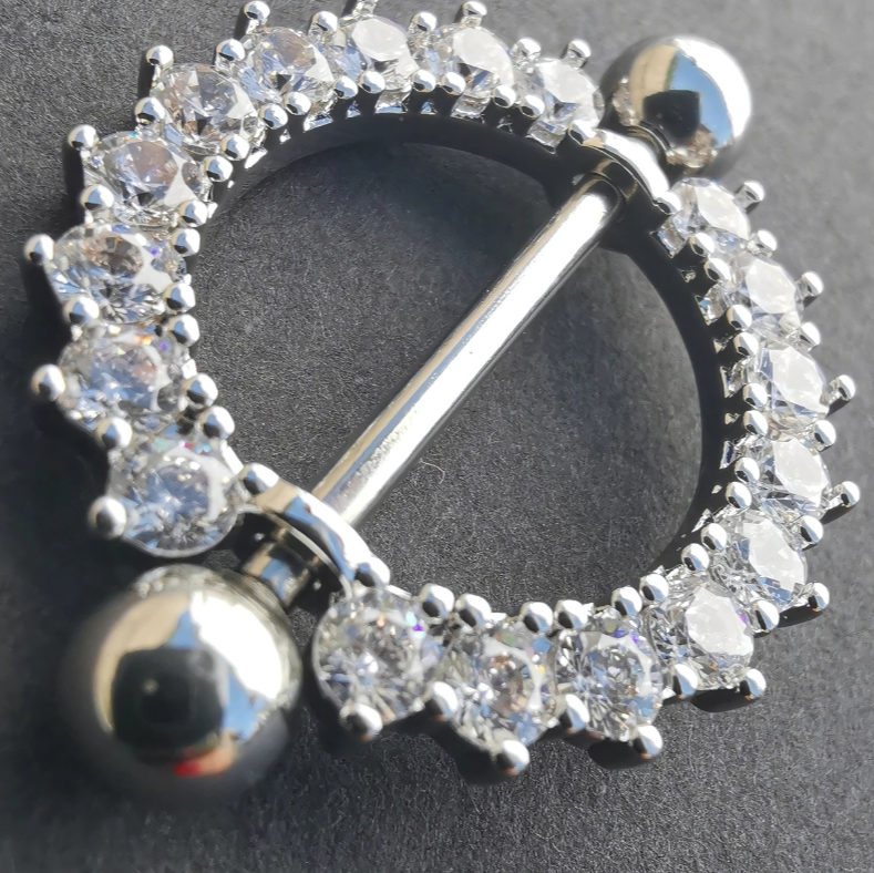 Add some sparkle to your nipple piercing with our round Nipple shields! Made from hypoallergenic 316L surgical steel, these shields feature clear cubic zirconia for a touch of elegance. Elevate your look and make a statement with our sparkly nipple shields. Combine it with a sparkly Navel Ring to complete your style!